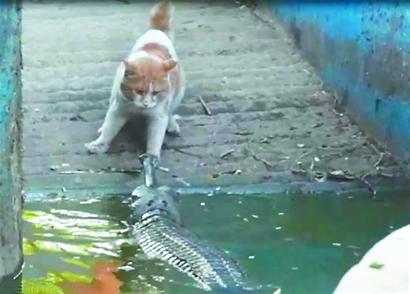 猫咪通常只捕捉老鼠等体型较小的动物,近日一名英国人则在印度一家动物园内拍摄到猫咪大战鳄鱼的视频。视频中,大胆无畏的猫咪“两巴掌”打在鳄鱼的脸部,成功将其击退。